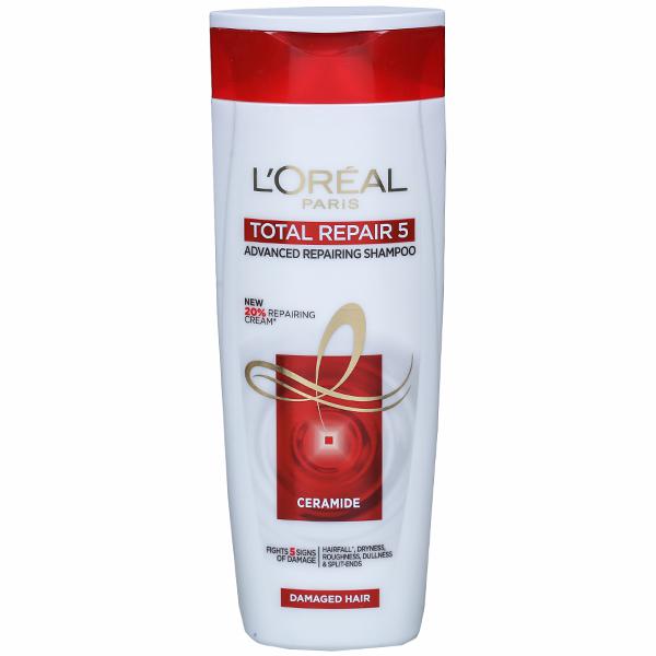5 Problems.1 Solution. LorealParis Total Repair 5 Repairing Shampoo helps fight against the five visible signs of damaged hair – Hair fall, dryness, roughness, dullness and split ends without weighing it down. Damaged hair can lack the natural ceMent which keeps the hair strong and resilient. To ensure cohesion and strength, the L?Oreal Laboratories have created Ceramide-CeMent technology to replicate the hair?s natural ceMent, targetting the 5 problems. Explore our best hair products to revive and repair damaged hair.